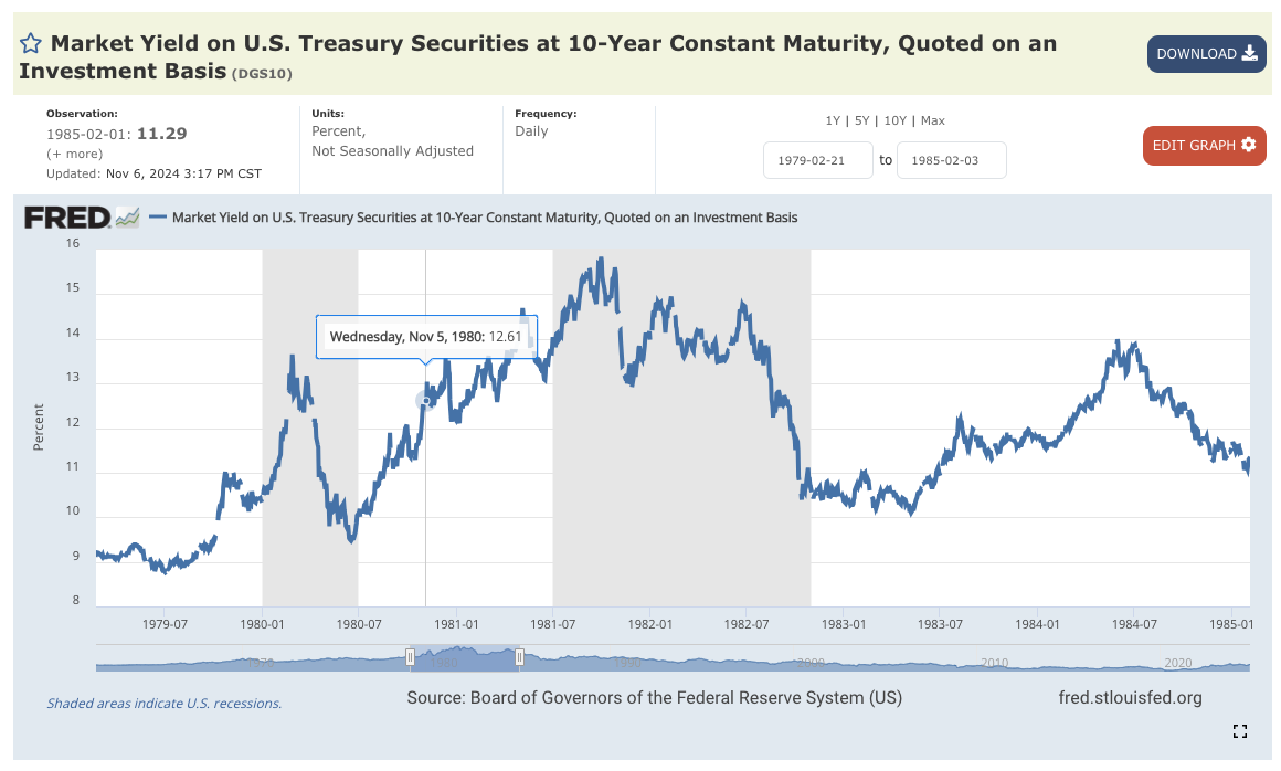 US Treasury 10yr rates see their highest rates of all time in September of 1981, and then drop 500 basis points before the Recession is over: