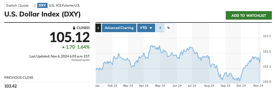 So to begin with, let’s review the US Dollar. Here the likelihood and eventual reelection of Trump has correlated with a strengthening of the Dollar into and through the Election. Note the spike in USD strength at the far right edge of the chart, on Election night.