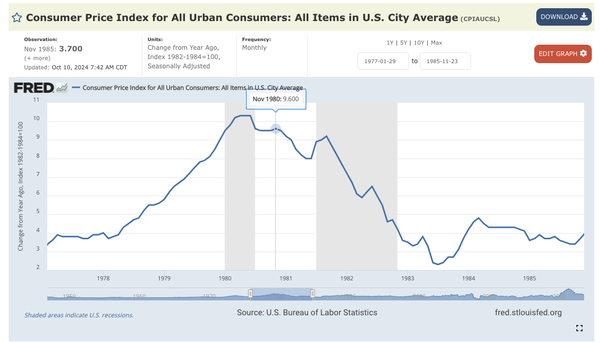 Inflation during this period would begin a decline from election night that would trend down, with a hiccup in the early months of the 1981 Recession.
