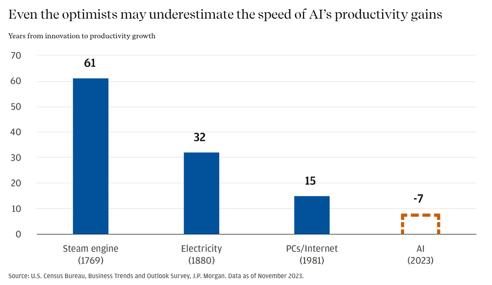 A recent report by the JPMorgan Private Bank, showed that the time between innovation and productivity gains were shortening for major innovations.