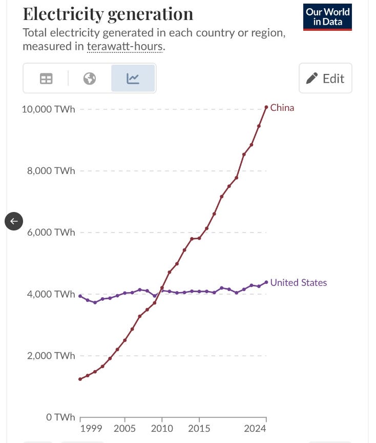 Along with the need for data centers, comes the related need for energy production. China is vastly in front of the US in terms of its energy creation.
