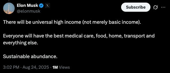 In late August 2025, amidst the ongoing breakneck rollout of new AI models and tools, Elon Musk wrote a tweet response on Twitter/X about Universal Basic Income (UBI), where he indicated that we will have “…universal high income (not merely basic income).”