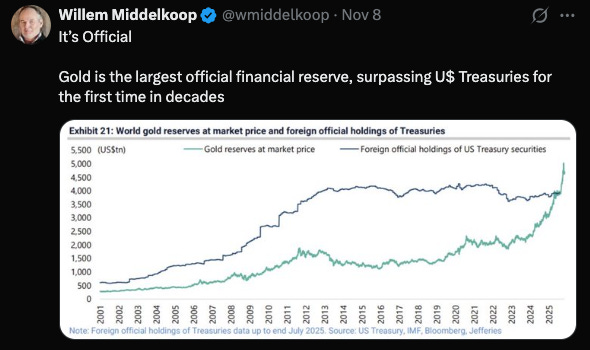 Gold has officially shot past US Treasuries as reserve assets globally: