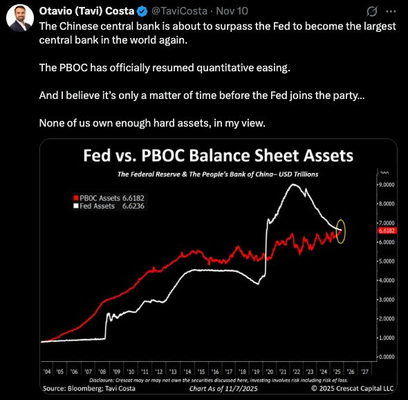 Relatedly, we’ve shown that China has been acquiring large positions in gold over the past months, and with these purchases and the gains in gold, the PBOC balance sheet assets have now eclipsed again the balance sheet assets of the US Federal Reserve: