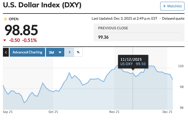 If we project this trendline out to December 3, we get a number around 98.39, which is very close to where the DXY sits at the time of writing this note (98.85).