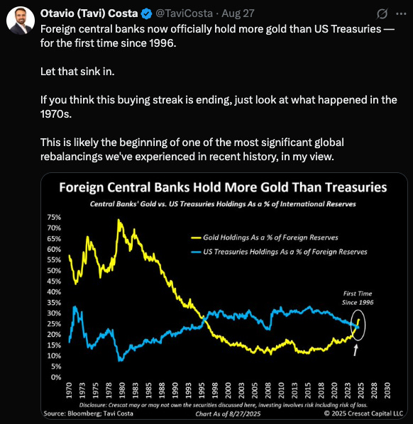 Related to this, central banks continue to buy gold, rotating away from US Treasuries, despite the sideways price action in the yellow metal.